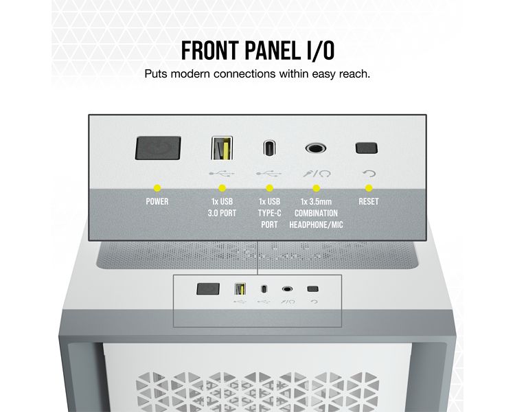 Bahias: Internas: 2 x 3'5, 2 x 2'5 Color Del Producto: Blanco Conectores: USB-C 3.1 x 1, USB 3.0 x 1, Audio In/Out F.A.: No Formato: ATX Formato F.A.: ATX Medidas: 466 x 453 x 230 mm Potencia F.A.: Sin fuente