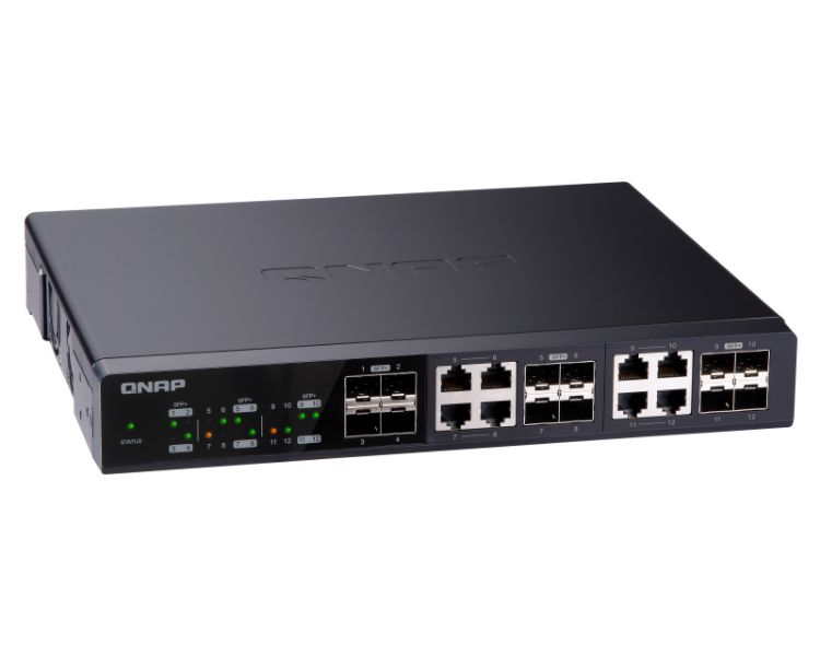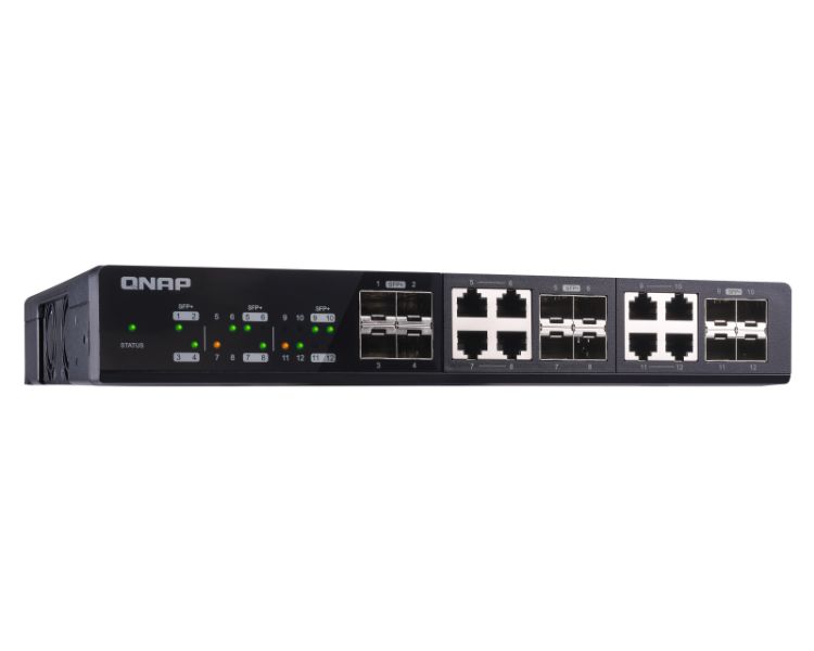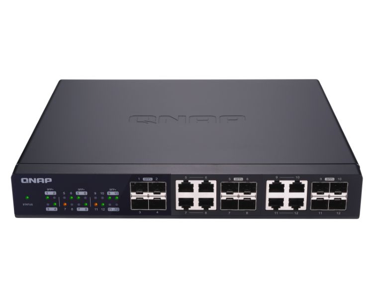 El switch QSW-1208-8C de 12 puertos ofrece una combinación de cuatro puertos SFP+ (fibra) y ocho puertos SFP+/RJ45 (cobre) que permiten realizar distintas conexiones en el mismo switch. Con conexiones RJ45, 10 GbE es compatible con cables de Cat 6a (o superior). De forma alternativa, se pueden usar cables de conexión directa (DAC) de cobre con puertos SFP+ para la conexión con servidores en un rack. La capacidad de conmutación del QSW-1208-8C es de 240 Gbps, lo que garantiza el máximo potencial de cada puerto.